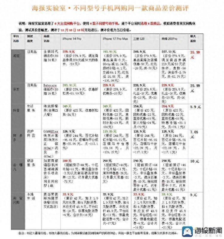 11月10日13时,海报实验室启动专项测评,选取淘宝、京东、抖音、拼多多、去哪儿、淘宝闪购6大主流网购平台,以iPhone 14 Pro(以下简称iPhone 14 P)、iPhone 17 Pro Max(以下简称iPhone 17 PM)、三星S20、荣耀200Pro四款机型为测试载体,模拟普通消费者真实购物场景,对日用品、生活服务、旅游等6类商品同步比价,同款商品的价格对比在10分钟内完成,试图揭开“设备价差”的面纱。